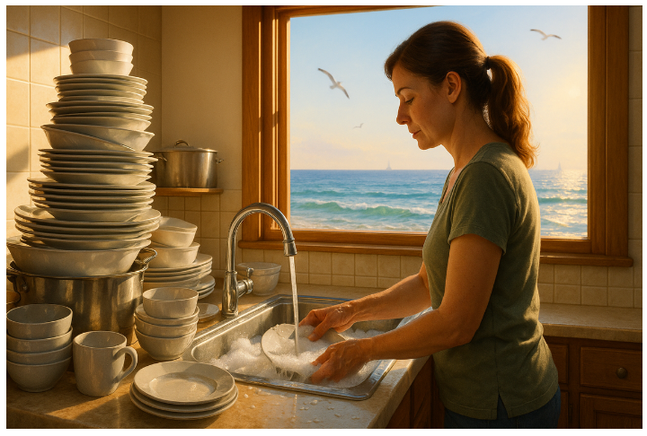 — Мелочи, говоришь? — тётя Зина вдруг взяла нас под локти, развернула к веранде. — Вот тут посуда гора с вечера осталась, сковородки подгорели, их надо отмыть. В домике третьем постели поменять, выгладить наволочки, на кухне полы — три раза, потому что песка натаскали. И фруктов, да, яблоня пошла; корзины в сарае, ведро брать большое.