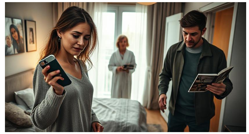 Марина отстранилась и начала доставать вещи из сумки, развешивая их обратно в шкаф. Денис присел на корточки и начал собирать разбросанные фотографии. На одной из них была запечатлена его свадьба — он и Марина, молодые и счастливые, а рядом улыбающаяся мама.