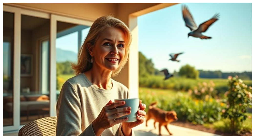 Через полгода Лена сидела на террасе своего нового загородного дома, пила утренний кофе и смотрела, как её собака гоняла голубей по саду. В доме было тихо, уютно и спокойно.