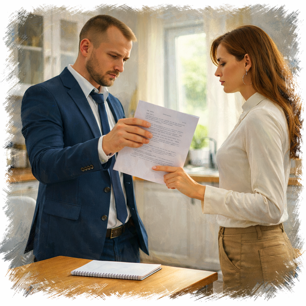После разговора Алена подошла к стенке, где в верхнем ящике лежала синяя картонная папка с надписью «Документы». Папка была на месте. Внутри — паспорт, свидетельство на квартиру, договор купли-продажи, страховки. Всё в порядке. Она уже хотела закрыть крышку, как взгляд упал на сложенный вдвое лист бумаги, засунутый между страницами договора. Чужой. Она вытащила. Расправила.