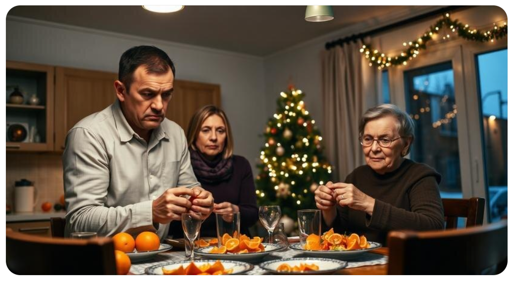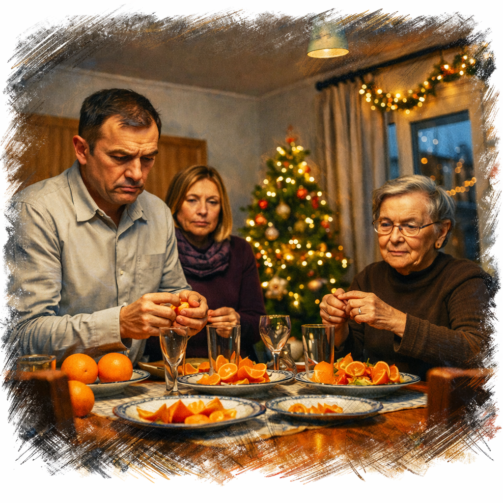 Вера медленно подняла голову. В руках у неё был апельсин — кожура уже снята наполовину, пальцы липкие от сока. На плите остывал чайник, из комнаты доносился голос ведущего с телевизора, обещавшего небывалые акции к праздникам. За окном, на соседнем доме, моргали огоньки — дешёвая гирлянда, но настойчивая, как реклама.