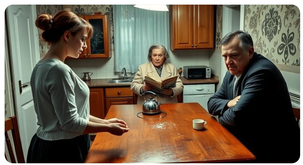 На кухне – словно застывшая картина их семейного ада: Лидия Петровна восседает за столом, спина прямая, руки сложены перед собой, словно она здесь – верховный судья этого маленького домашнего процесса. Валерий Иванович, как всегда, спрятался за щитом газеты, лишь бы не участвовать.