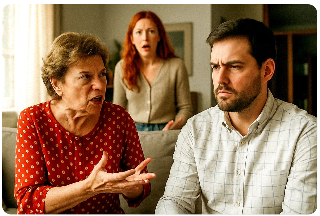 — Ну-ка, дай мне трубку, я поговорю со свекровью. И перестань горланить на всю квартиру. Вон уже красными пятнами покрылся весь.